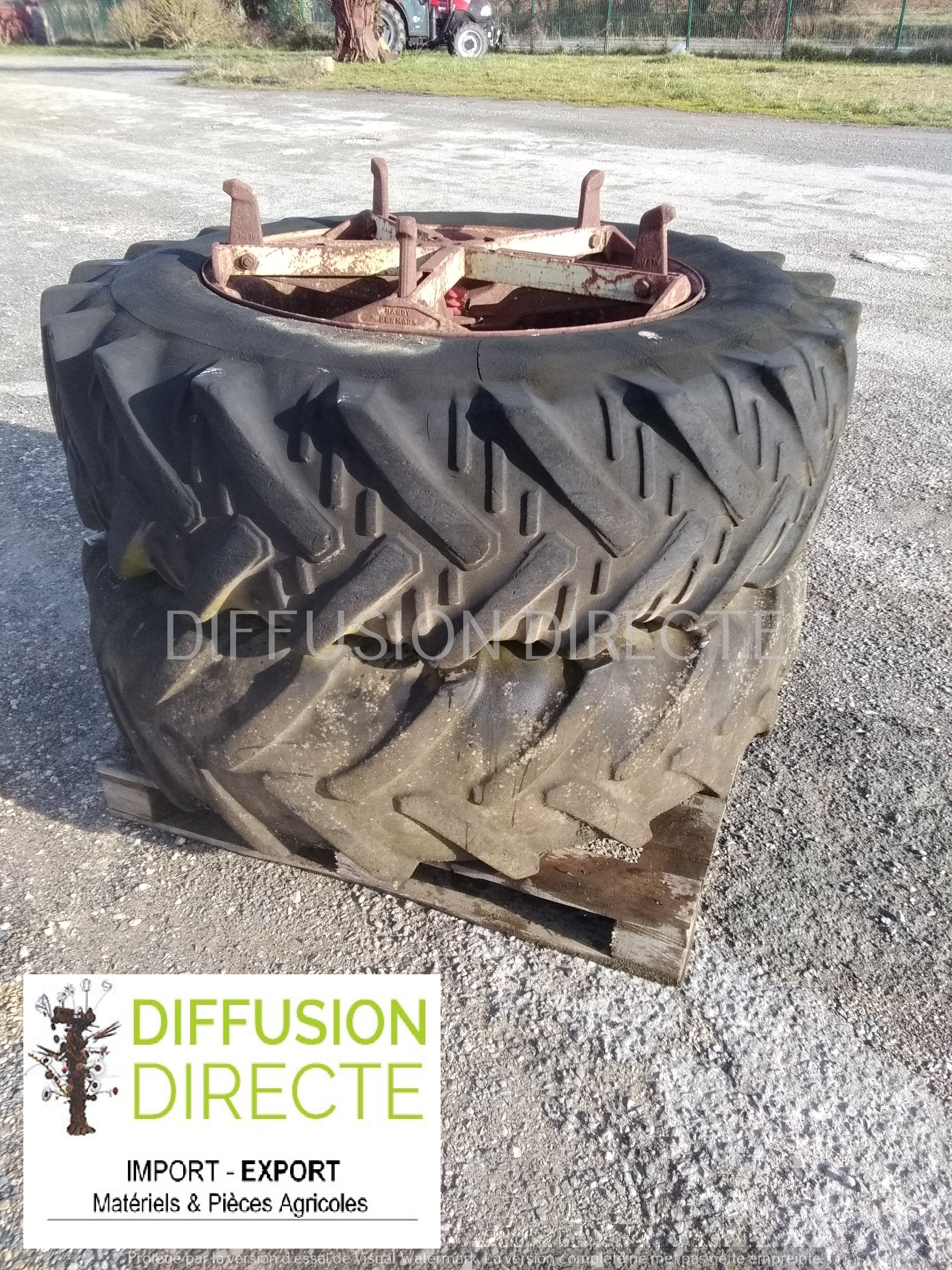Dimension : 16.9R34 - pneus usés à 90 % d'usure (et craquelés) - mauvais état.